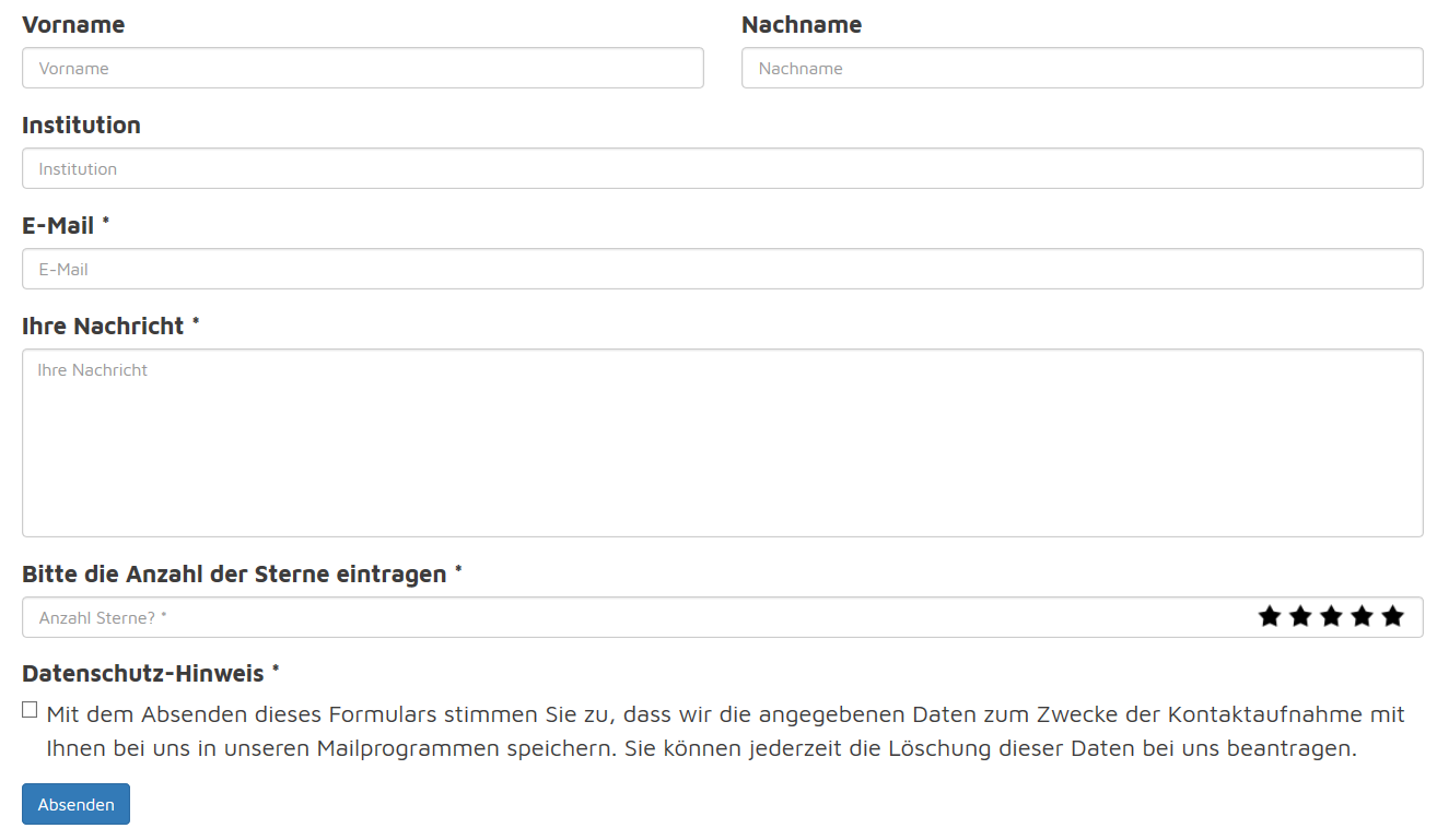 Das Captcha ist im BYSEUM-System in allen Formularen technisch hinterlegt. Ihre digitalen Besucher müssen nun - um zu beweisen, dass sie "echte Menschen" sind - zunächst Sterne zusammenrechnen (dies ist ein Pflichtfeld), um ein Kontaktformular oder ein Anmeldeformular etc. absenden zu können.