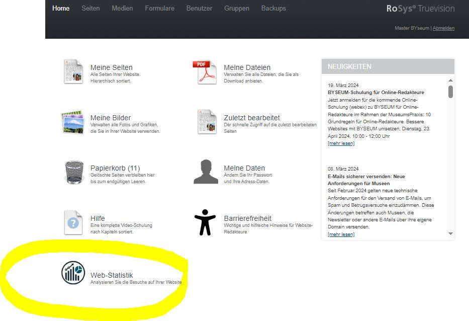 Nach der letzten BYSEUM-Schulung "10 Grundregeln für Online-Redakteure" wurde beschlossen, um die Nutzung der standardmäßig integrierten Datenverkehrsanalyse mit Matomo (ehem. Piwik) zu fördern, im Backend von BYSEUM einen Direktzugriff über das Dashboard zu ermöglichen. Dieser ist nun erfolgreich umgesetzt!