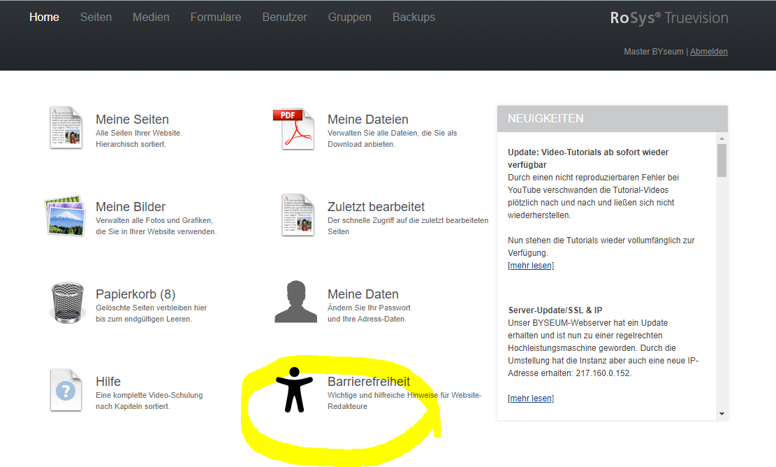Es stehen nun im BYSEUM-CMS alle technischen Möglichkeiten zur Umsetzung von digitaler Barrierefreiheit zur Verfügung. Nun sollten Sie, als Online-Redakteur, tätig werden und weitere Schritte in der Umsetzung unternehmen. Im Hilfebereich - zu finden im Dashboard des Systems - finden sich Hinweise sowie eine Checkliste, die es Ihnen ermöglicht Ihre eigene Website Schritt für Schritt anpassen und entsprechend zu aktualisieren. Diese wird ggf. weiter aktualisiert.