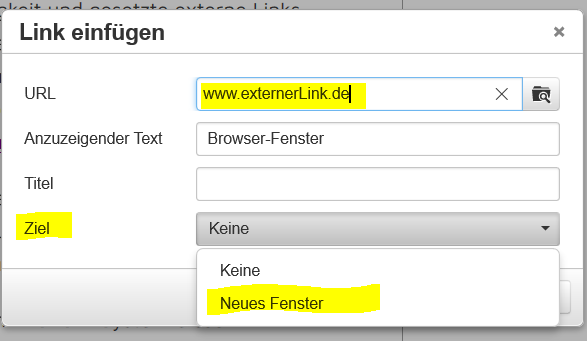 Links sollten immer sorgfältig auf den zu verlinkenden Text gesetzt werden. Dabei wird zwischen internen und externen Links unterschieden. Der interne Link führt zu Inhalten der eigenen Webseite und kann daher für den Nutzer im gleichen Browser-Fenster geöffnet werden ("Ziel: Keine"). Links zu externen Webseiten/Inhalten, sollten nur mit Bedacht und ausschließlich zu zuverlässigen Quelle gewählt werden. Nicht nur, dass der Webseitenbetreiber auch für die von ihm gesetzten Links haftet, sondern man will natürlich auch nicht ständig "broken links" redaktionell nachpflegen.