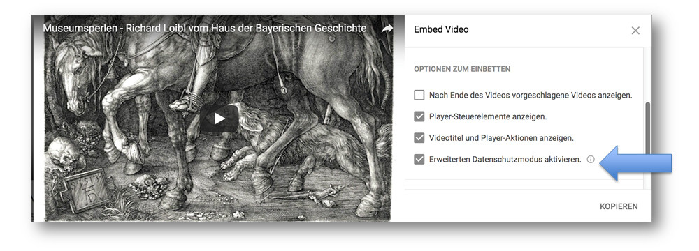 Wer Videos von YouTube datenschutzorientiert einbetten will, sollte auf der YouTube-Webseite sein Video suchen, dort auf Teilen, Einbetten tippen > mehr anzeigen und den erweiterten Datenschutz aktivieren (vgl. Screenshot).